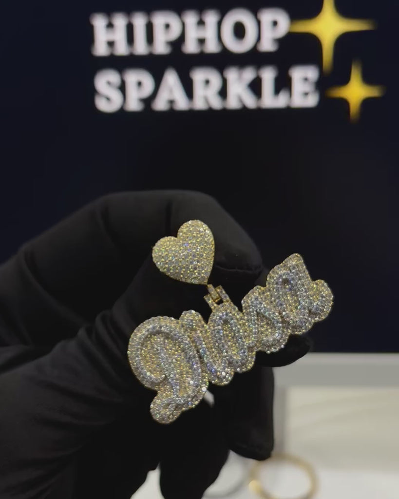 Every part of the name and heart bail is completely covered in VVS Moissanite stones, giving it diamond-like brilliance and guaranteed tester-pass fire.