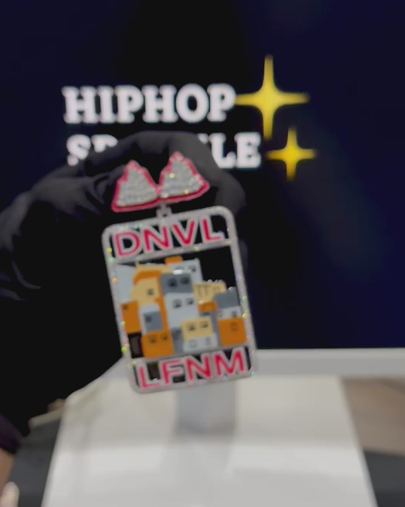 Both the DNVL (top) and LFNM (bottom) lettering are filled with bold enamel, giving the pendant a loud and premium street-style identity.
