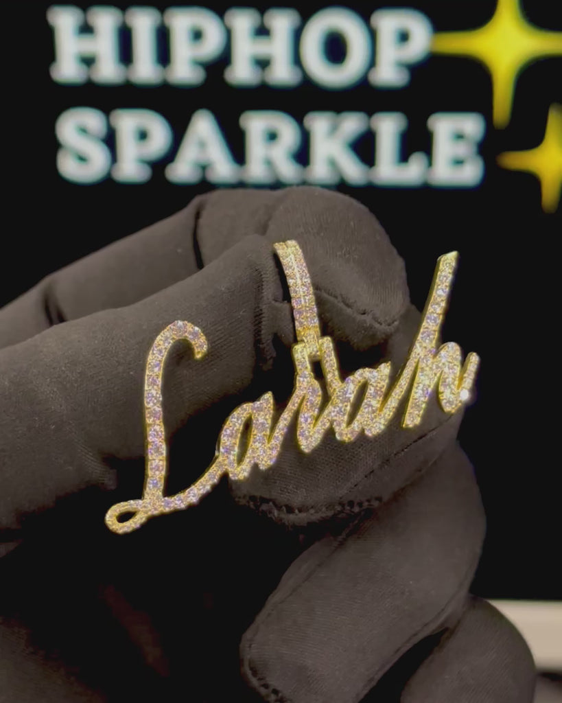 Turn heads with this stunning Larah custom name pendant, crafted in an elegant script font and fully iced with premium VVS Moissanite stones.
