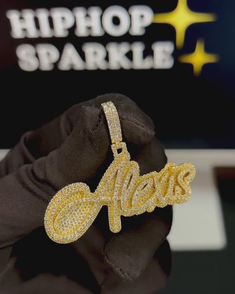 Show off elegance and shine with the Alexis Custom Name Pendant, designed in a flowing cursive letter style for a sleek luxury look. Fully iced out with VVS moissanite diamonds, this pendant glitters from every angle, delivering the same brilliance as real diamonds.