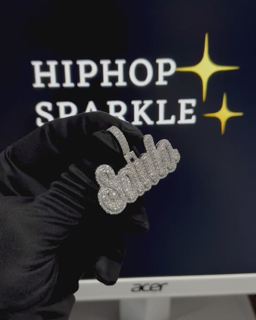 Turn your name into luxury with this custom Saulo iced-out pendant, crafted in solid 925 silver and handset with premium VVS Moissanite diamonds for maximum shine. Designed in a smooth, bold cursive font, this pendant delivers a clean statement piece perfect for hip hop fashion and everyday flexing.