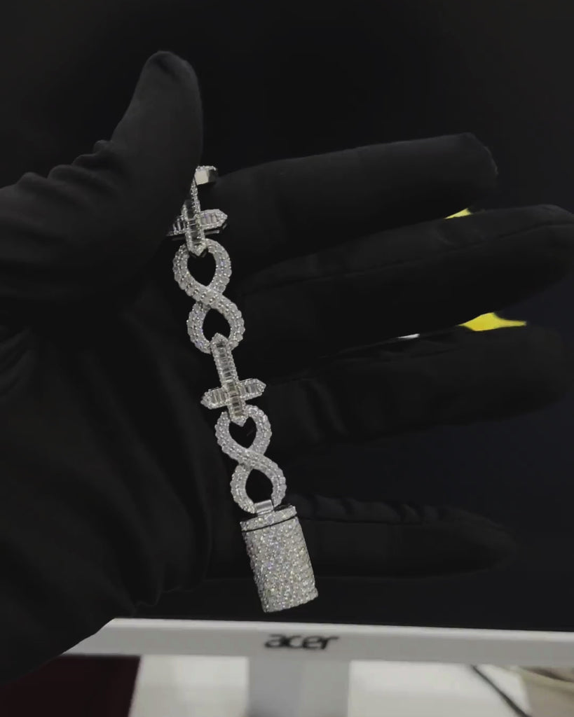 Make a bold statement with this Cross & Infinity Link Iced Out Bracelet, a symbol of faith and limitless style. Expertly crafted in 925 sterling silver, this bracelet features a stunning pattern of cross and infinity links, fully covered with premium moissanite stones for next-level brilliance and shine.