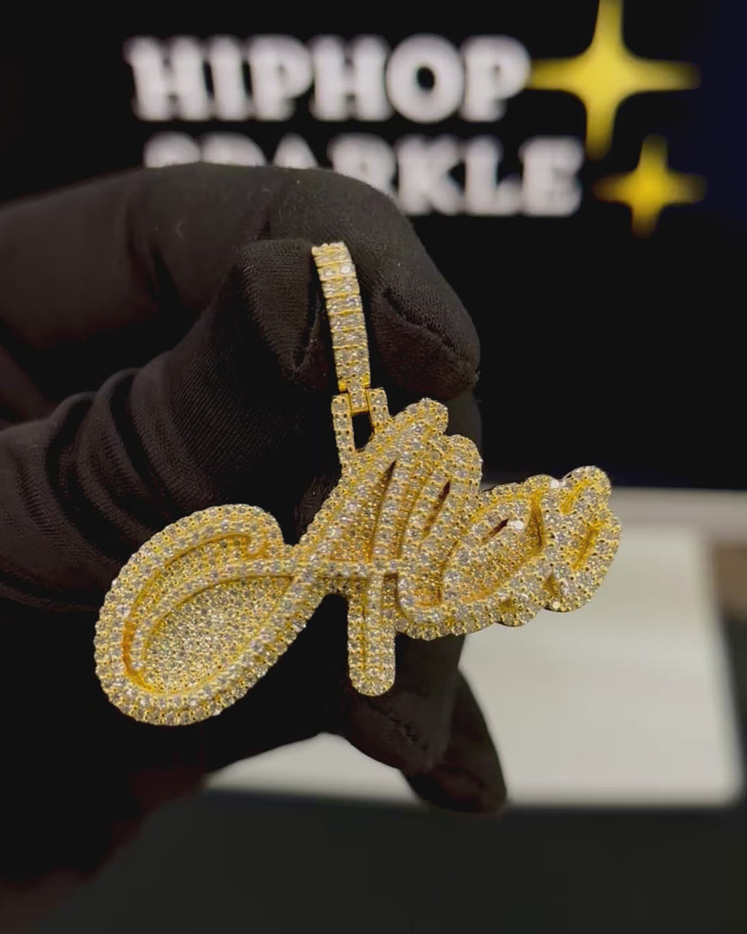Show off your style with the Alex Custom Name Pendant, a bold and personalized piece of hip hop jewelry. Designed in a sleek cursive style and fully iced out with VVS moissanite diamonds, this pendant delivers unmatched shine and brilliance that rivals natural diamonds.