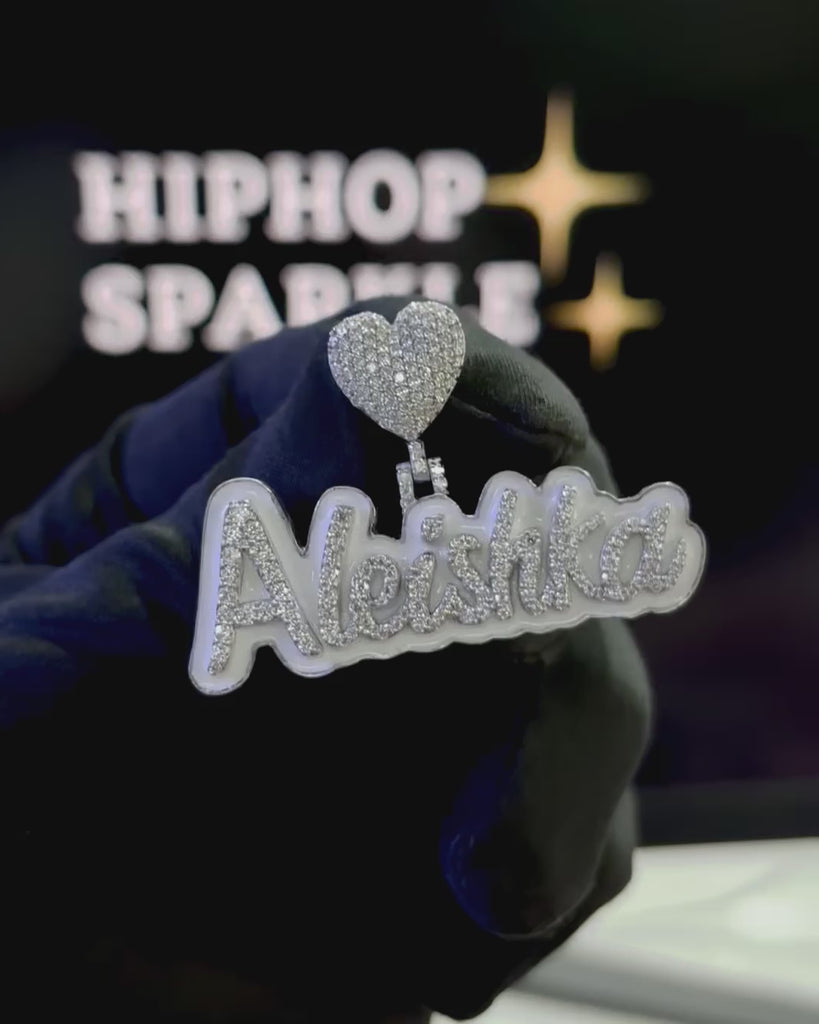 Shine in style with the Aleishka Custom Name Pendant, crafted in 925 sterling silver and fully iced out with VVS moissanite diamonds. The pendant features a white enamel background for extra contrast and brilliance, while the heart-shaped bail adds a unique, stylish touch.