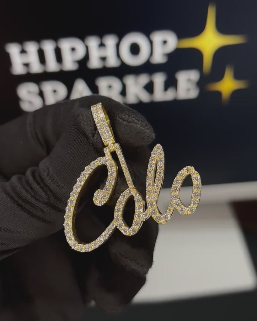 Show off your style with the Colo Custom Name Pendant, crafted in 925 sterling silver and fully iced out with VVS Moissanite diamonds for unmatched shine. With a length of 1.70 inches and a height of 1 inch (without bail), this pendant is the perfect size for everyday wear or hip hop fashion.