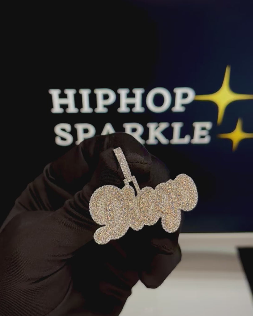 At 2 inches in size, the Diego pendant is fully iced out with handset Moissanite diamonds, giving it unmatched sparkle and fire that rivals real diamonds. Perfect for Cuban, rope, or tennis chains, this custom pendant makes your name the centerpiece of your look.