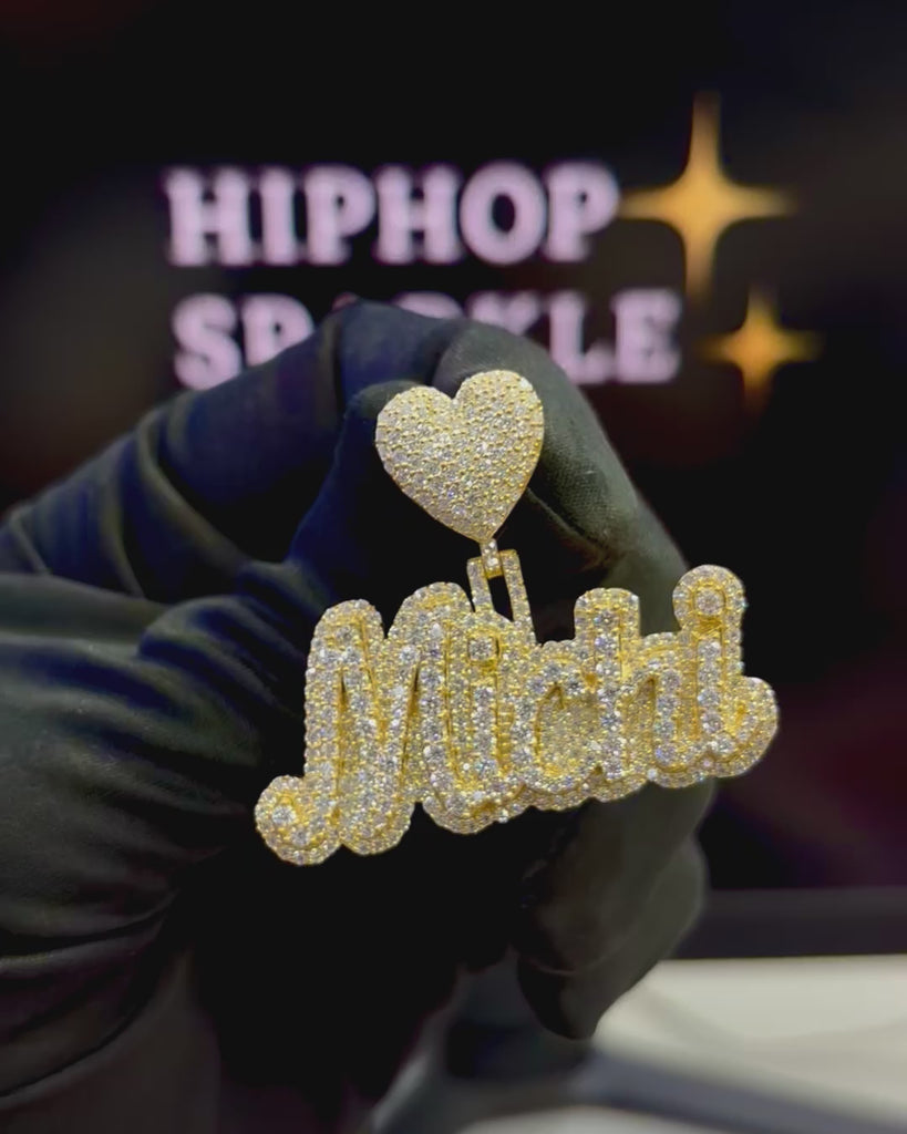 Turn heads with the Michi Custom Name Pendant, beautifully crafted in 14K gold plating over 925 sterling silver and fully iced out with VVS moissanite diamonds. The design features a stylish heart-shaped bail, adding a unique and elegant touch to your hip hop look.