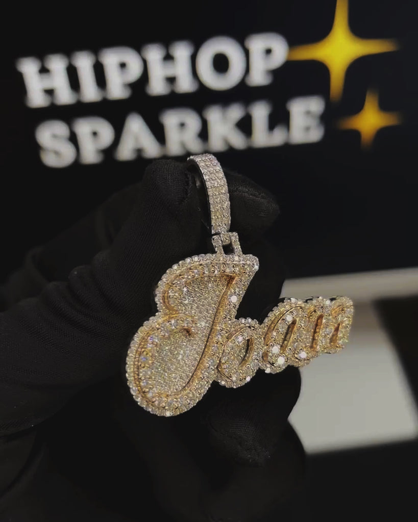 Turn heads with the Joan Custom Name Pendant, crafted in a stunning two-tone finish of silver and rose gold. This unique cursive pendant is fully iced out with VVS moissanite diamonds, giving it a flawless shine from every angle.