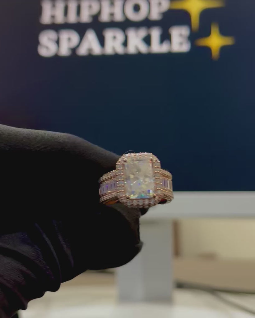 Turn every spotlight your way with this Radiant Cut Iced Out Ring, crafted for those who love to shine loud and proud. The centerpiece features a large radiant-cut moissanite diamond, surrounded by a double halo of brilliant stones for unmatched fire and brilliance.